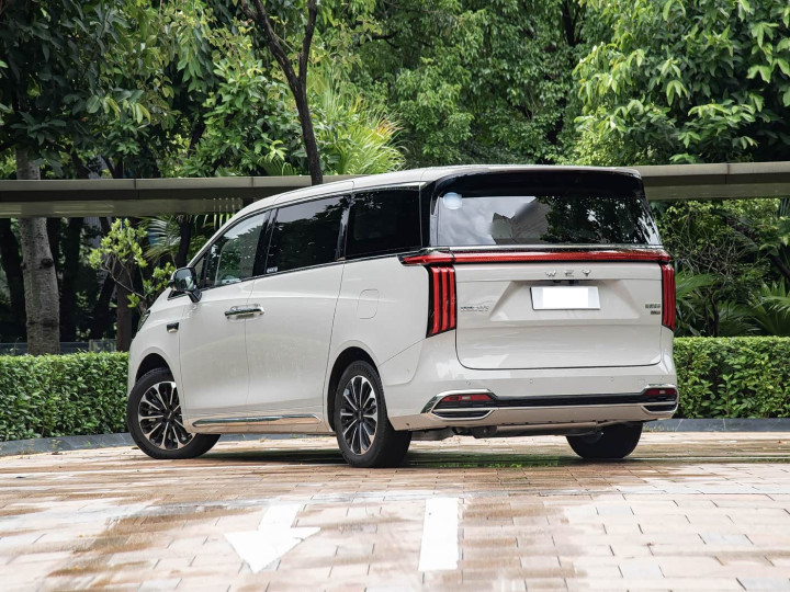 再来看车尾部分,车尾设计与车头形成完美呼应,贯穿式 LED 尾灯是核心亮点,灯组内部采用分层式光导结构,夜间点亮后呈现出流水般的动态效果,与下方 “WEY” 字母标识共同提升辨识度。尾门上方的扰流板优化了空气动力学性能,同时集成高位刹车灯,功能性与美观度兼备。后保险杠采用双色设计,上半部分与车身同色,下半部分用黑色饰板包裹,中间嵌入横向镀铬饰条,视觉上拉宽车尾比例。