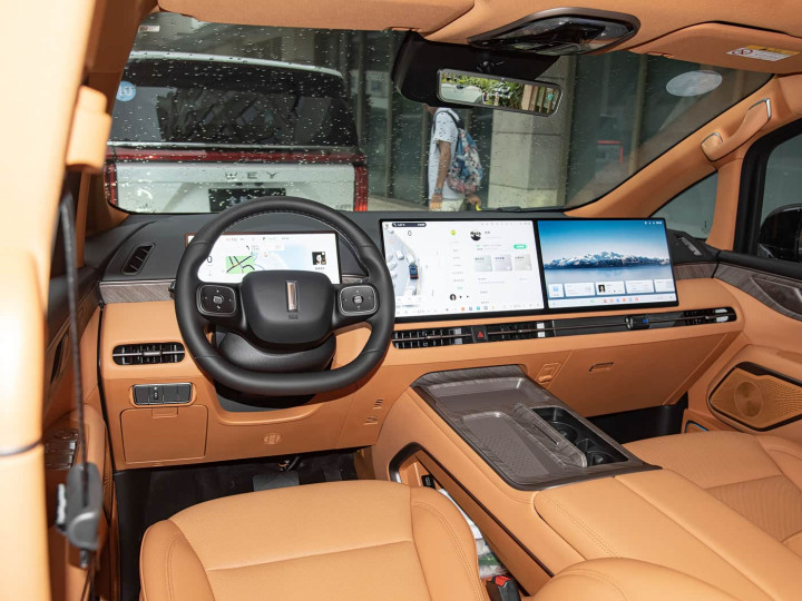 进入车内,高山 7 的内饰主打科技豪华风格,四屏交互系统堪称核心亮点 ——12.3 英寸全液晶仪表、15.6 英寸中控屏、15.6 英寸副驾娱乐屏与 17.3 英寸后排娱乐屏联动,搭载高通骁龙 8295P 芯片,操作流畅度媲美高端智能手机。Coffee OS 3 智能座舱支持六音区语音交互,空间灵活性是高山 7 的核心优势,2+2+3 七座布局配合纯平地板与二三排共轨设计,第三排座椅可前后滑动调整,175cm 乘客落座后,腿部空间可达两拳(座椅调至最后)。选装第二排零重力座椅后,虽会占用中央通道,但座椅支持多角度调节,长途乘坐舒适性大幅提升。